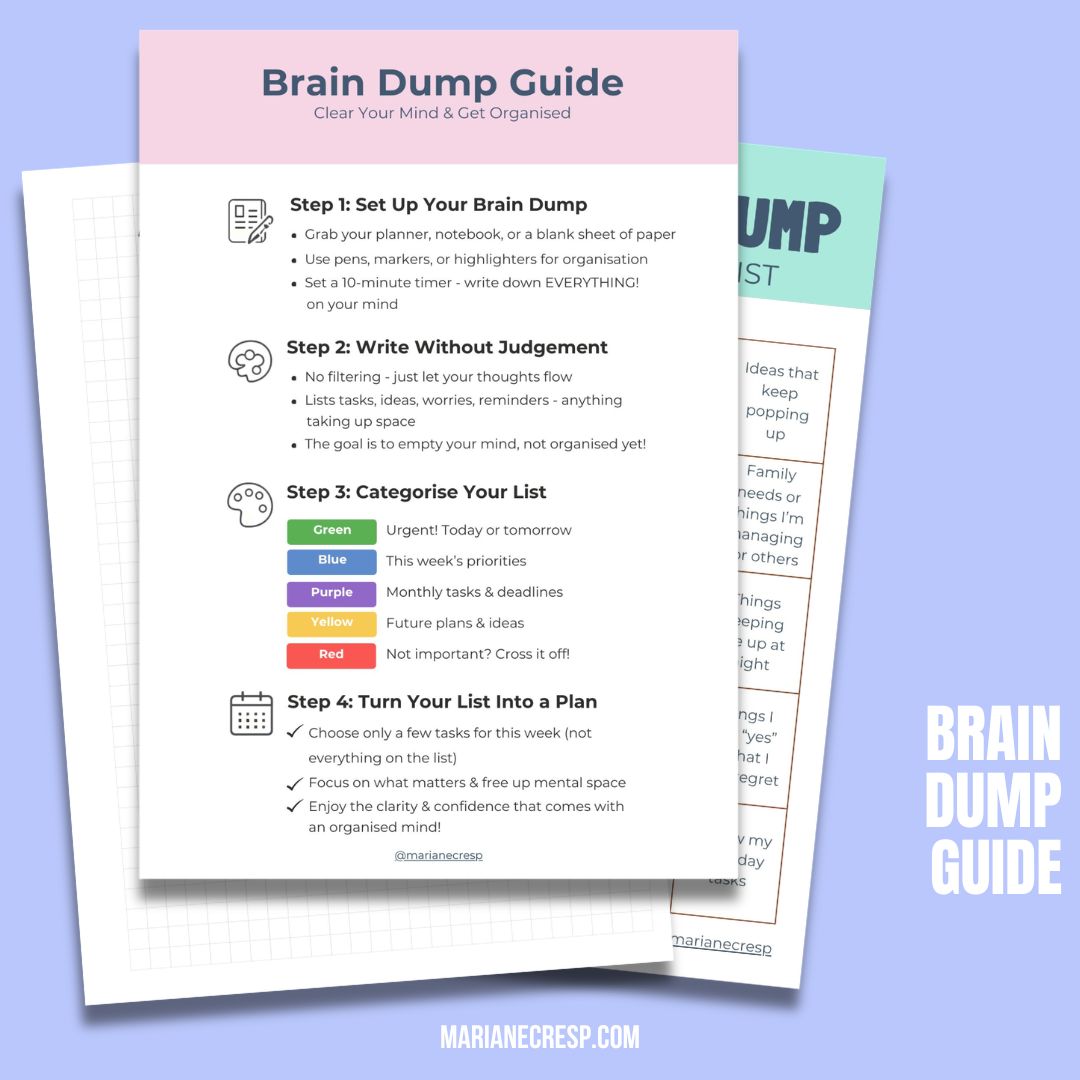 Download the free Brain Dump Guide to sort what’s swirling, organise it into simple steps, and gently focus on what matters next.