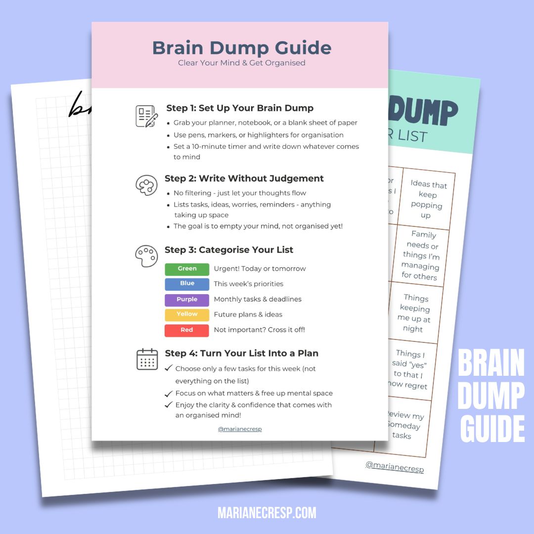 Download the free Brain Dump Guide to sort what’s swirling, organise it into simple steps, and gently focus on what matters next.